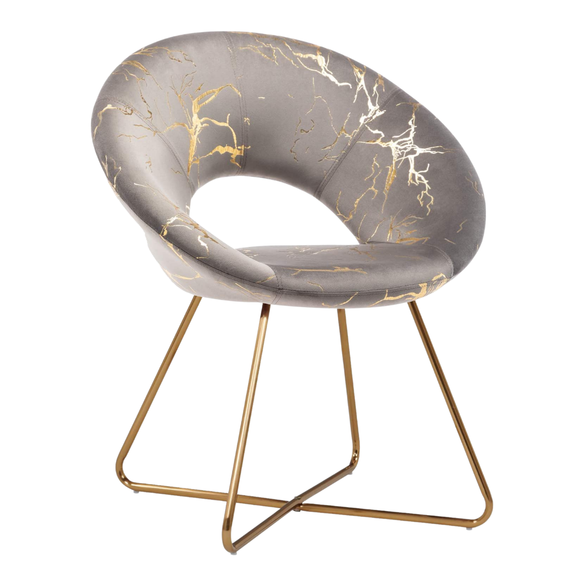 Vanity chair in grey velvet with gold accent: 22" length by 33" height.